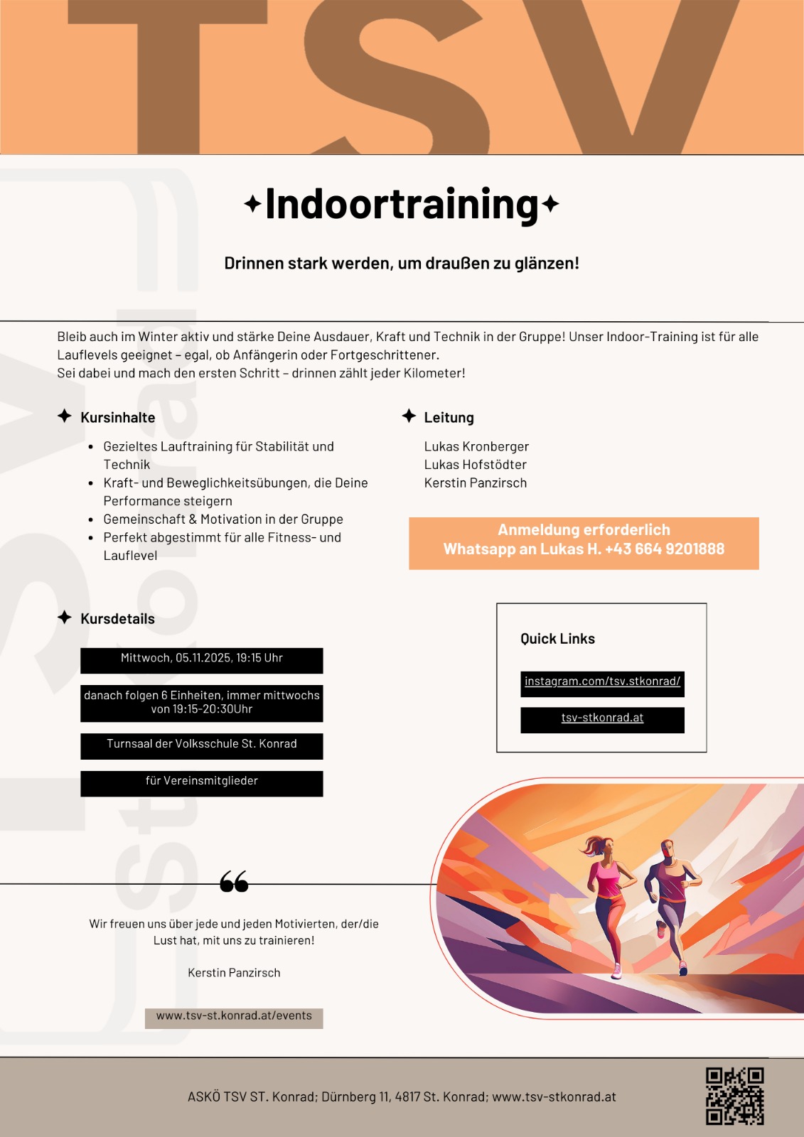 Am Mittwoch, 05.11.25 beginnt wieder ein Indoor-Lauftraining um 19.00 Uhr. Anmeldung erforderlich bei Lukas Hofstödter über What´s App: 0664 9201888 Alle Informationen dazu nachfolgend: WhatsApp Image 2025-10-06 at 20.09.15 WhatsApp Image 2025-10-06 at 20.09.16