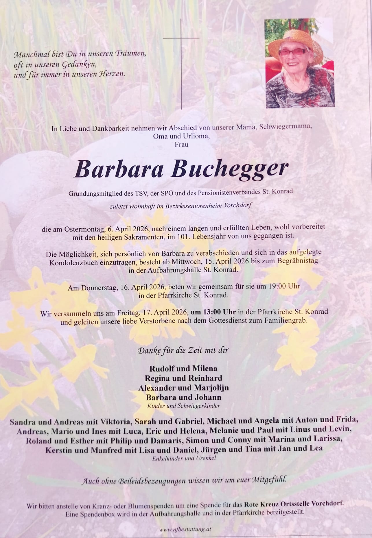 Barbara Buchegger ist am Ostermontag, dem 6. April 2026, im 101. Lebensjahr von uns gegangen.