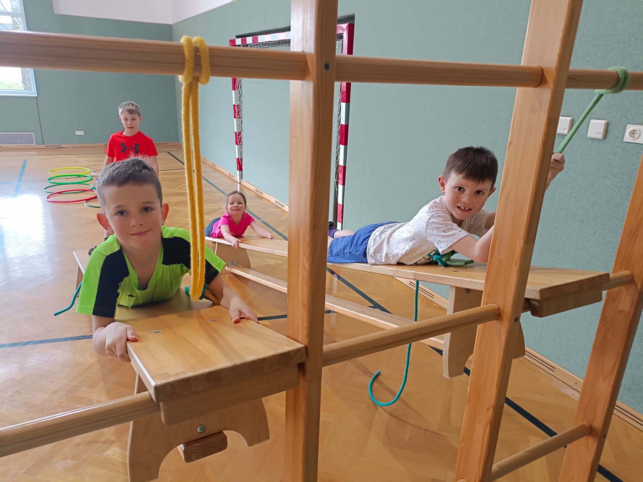 Im Turnsaal entstehen immer wieder neue Bewegungslandschaften, in denen die Kinder spielerisch ihre Geschicklichkeit und Kraft erproben. Besonders der Ninja‑Warrior‑Parcours sorgte für Begeisterung und ließ viele über sich hinauswachsen. Ein weiterer Höhepunkt war der Besuch der Boulderhalle, wo die Schülerinnen und Schüler mutig neue Routen ausprobierten und gemeinsam Erfolge feierten.